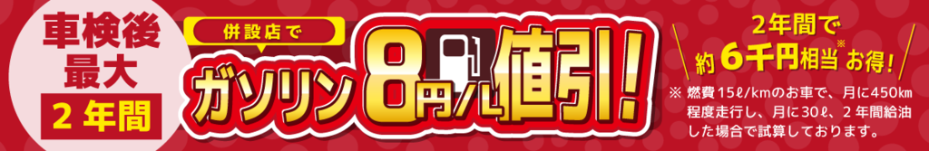 当店で車検を実施頂いた方は、 ガソリン割引特典を6ヶ月分進呈致します
